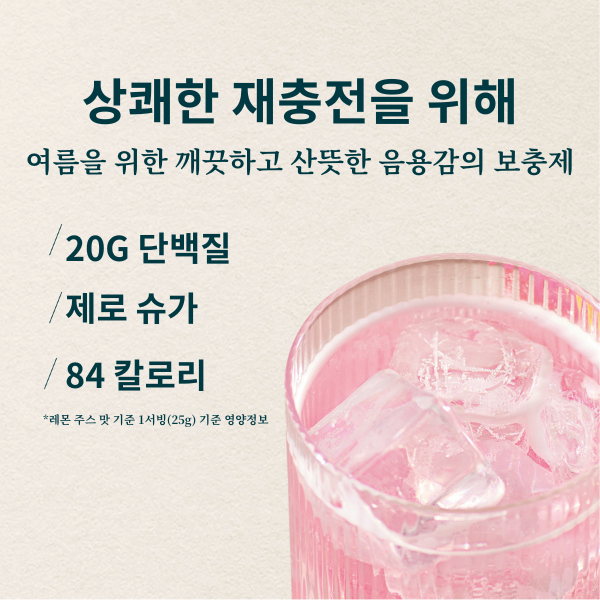 | 특징 | 1회 제공량 당 무려 단백질 20g 이 함유되어 있으며, 0.1g 의 지방 와 90 kcal 이하로 섭취하실 수 있습니다. | 상큼한 과일 맛으로 즐길 수 있으며, 하루 비타민 B 섭취량의 절반과 10g의 단백질을 포함하고 있습니다. | 운동에 도움을 주는 산뜻한 과일 맛 콜라겐 파우더는 1회 제공량당 근육 성장 및 유지에 효과적인 단백질1을 최소 18g 함유하고 있습니다. | 샘플 제품은 간편하고 편리하게 휴대가 가능한 제품으로, 원하는 맛을 체험할 수 있습니다. |